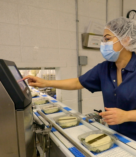 Employee placing cheese on conveyor belt